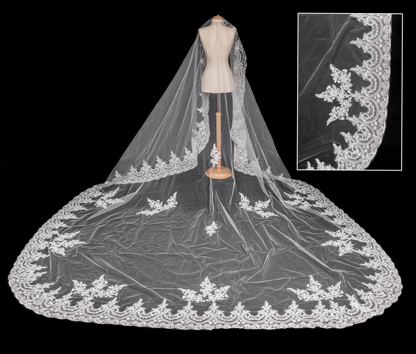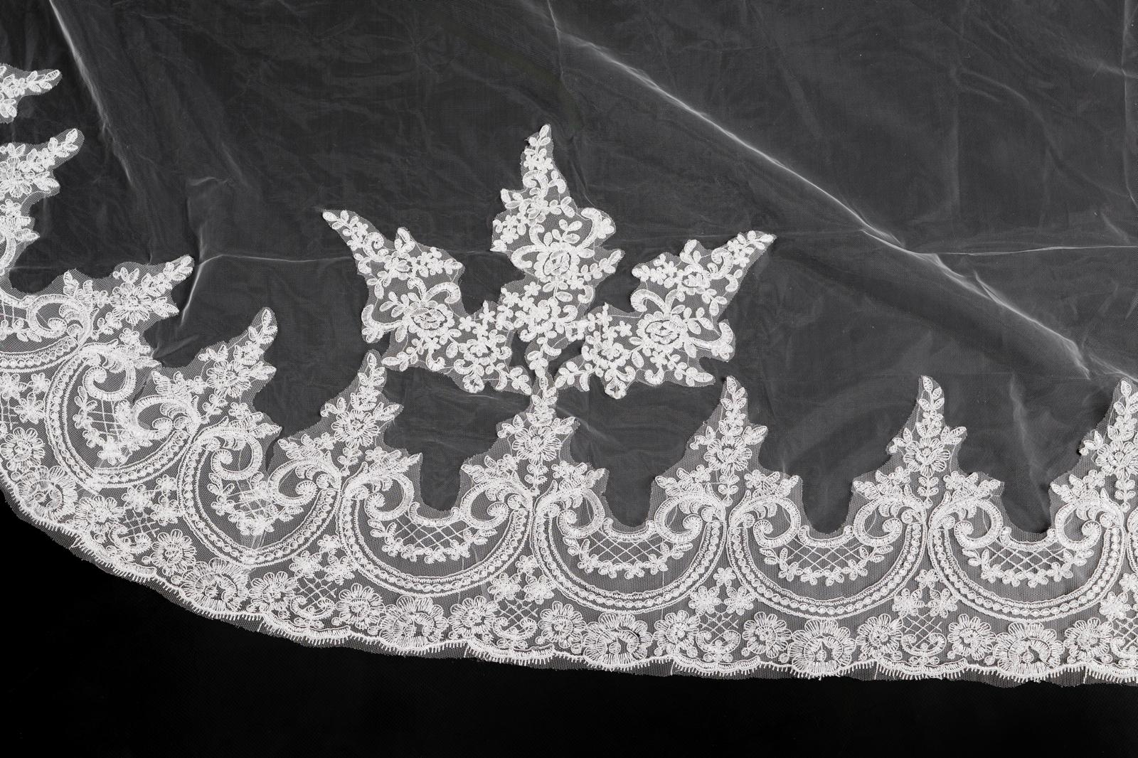 Velo de tul blanco con aplicaciones y blonda bordadas