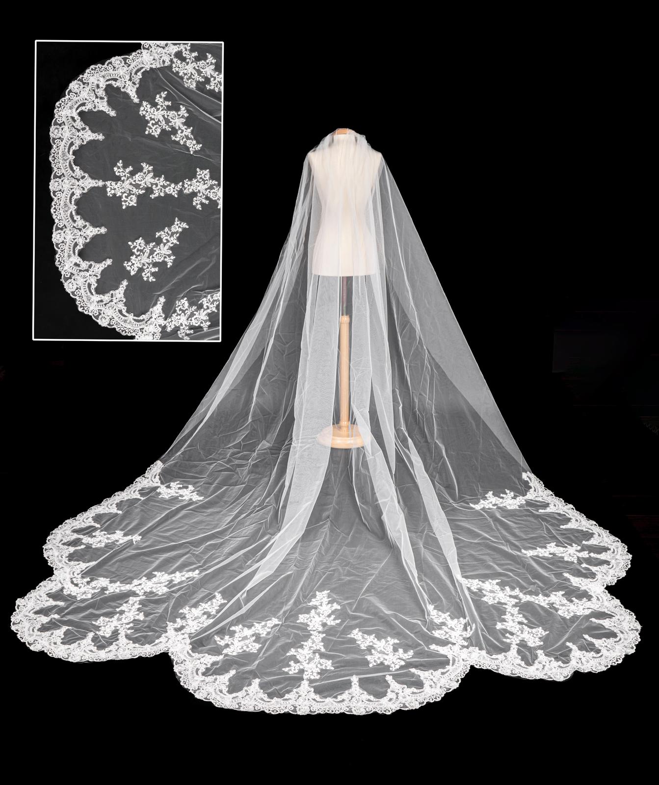 Velo de tul blanco, con aplicaciones y blonda bordadas
